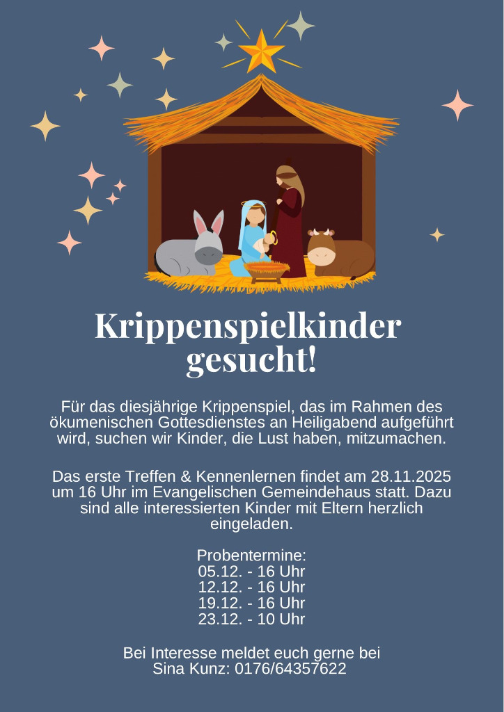 Kennenlernen am Donnerstag, 21.11.2024, um 17:00 Uhr im evangelischen Gemeindehaus für alle Interessierten Probentermine: Mittwoch, 04.12. – 17:00 Uhr, Freitag, 13.12. – 16:30 Uhr, Mittwoch, 18.12. – 17:00 Uhr, Montag, 23.12. – 10:00 Uhr, Die Aufführung ist an Heiligabend, Dienstag, 24.12., um 15:00 Uhr. ————————————————————————— Stern über Bethlehem, zeig uns den Weg,führ uns zur Krippe […]