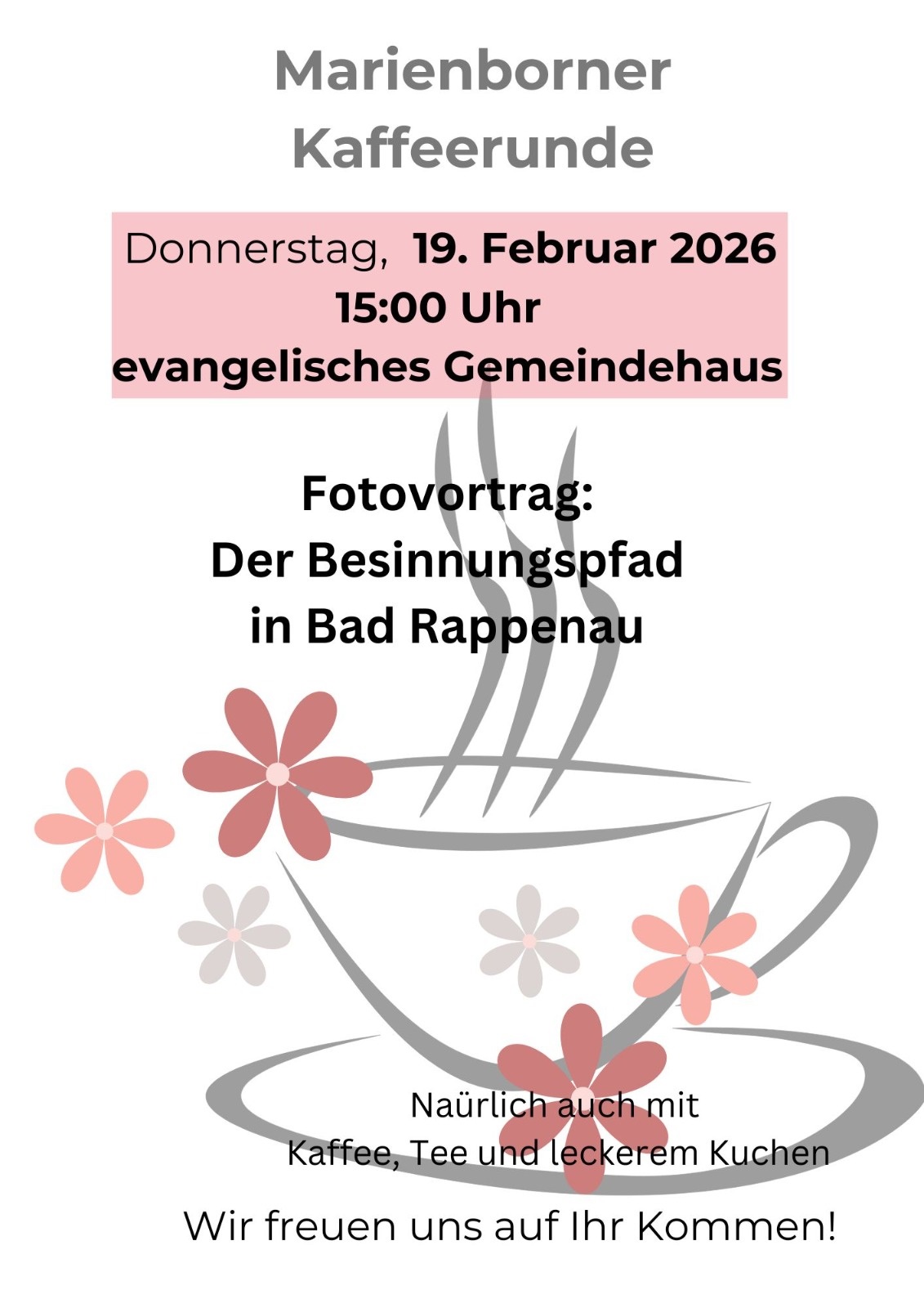 Dieses mal gehen wir in der Marienborner Kaffeerunde auf einen Spaziergang rund um Bad Rappenau. Wir entdecken den „Pfad der Besinnung“. Herzliche Einladung an alle Interessierten!