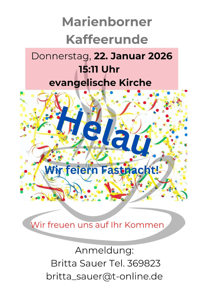 Bei Kreppel und Kaffee möchten wir eine kurzweilige Zeit miteinander verbringen. Kommen Sie gerne verkleidet.