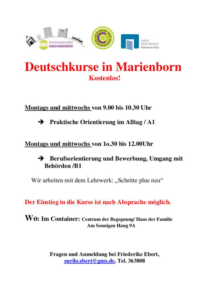Im Anschluss an diesen Kurs- ebenfalls am Montag- und Mittwochvormittag- folgt der Kurs „Gesellschaftliche und kulturelle Integration …“.